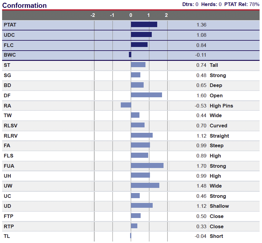 - 94HO21246 Roz is nearly perfect linear with great relationship between stature, strength, depth and openness. He is also positive for DPR and great for SCE.