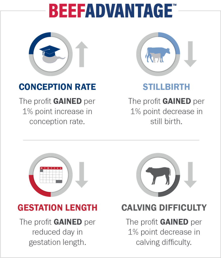 Every one of these impacts the reproductive success of a dairy. Getting a cow pregnant and transitioned back into peak milk production year after year in any operation is vital to its profitability and sustainability. Our BeefAdvantage Index takes the guess work out of selecting the right beef sires to use in your dairy. The index spells out the potential profit gained or lost on the dairy per increase or decrease change in each of those key areas, respectively.