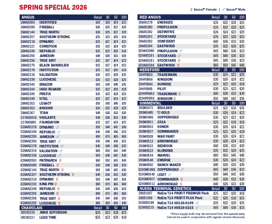 *Short supply bulls may be removed from the special early. Cannot be used in conjunction with regular volume discounts. **If payment for the Beef Deferred Program balance is not received by November 10, 2025, interest will be imposed on the unpaid balance from the due date of purchase at an APR of 15.00%. †Cash discount applies to all payments by check or electronic check received within ten days of order shipping. A 3% cash discount applies to all credit card payments as well; however, a 2.8% credit card convenience fee is added to the total cost.