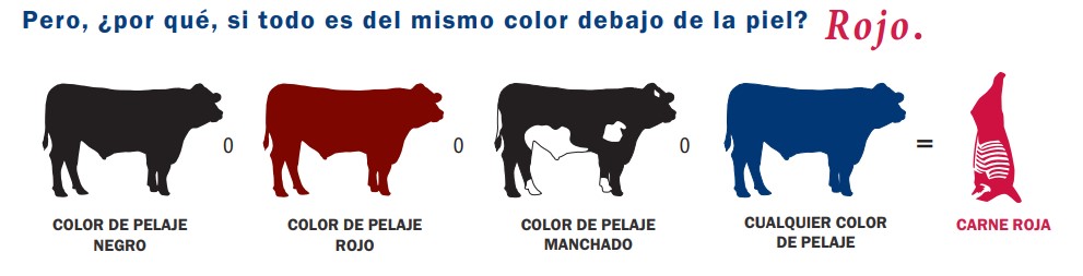 Si volvemos a nuestro escenario del caso de la carne, un consumidor nunca ve el color de la capa de pelo del animal beneficiado. El color del pelo no es un factor determinante para que el consumidor compre o no la carne. Lo que sí lo es, es la carne roja de alta calidad. La carne roja que ven en el empaque les motiva, y la realidad es que todos los animales cosechados en la cadena de suministro de carne de bovino tienen el mismo color bajo la piel. La genética del animal determina la calidad de la canal que producirá.