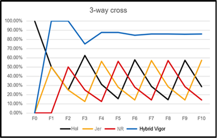 In this example, the Holsteins are 3 way crossed with Jersey first and the yellow line represents the % of Jersey in each generation.