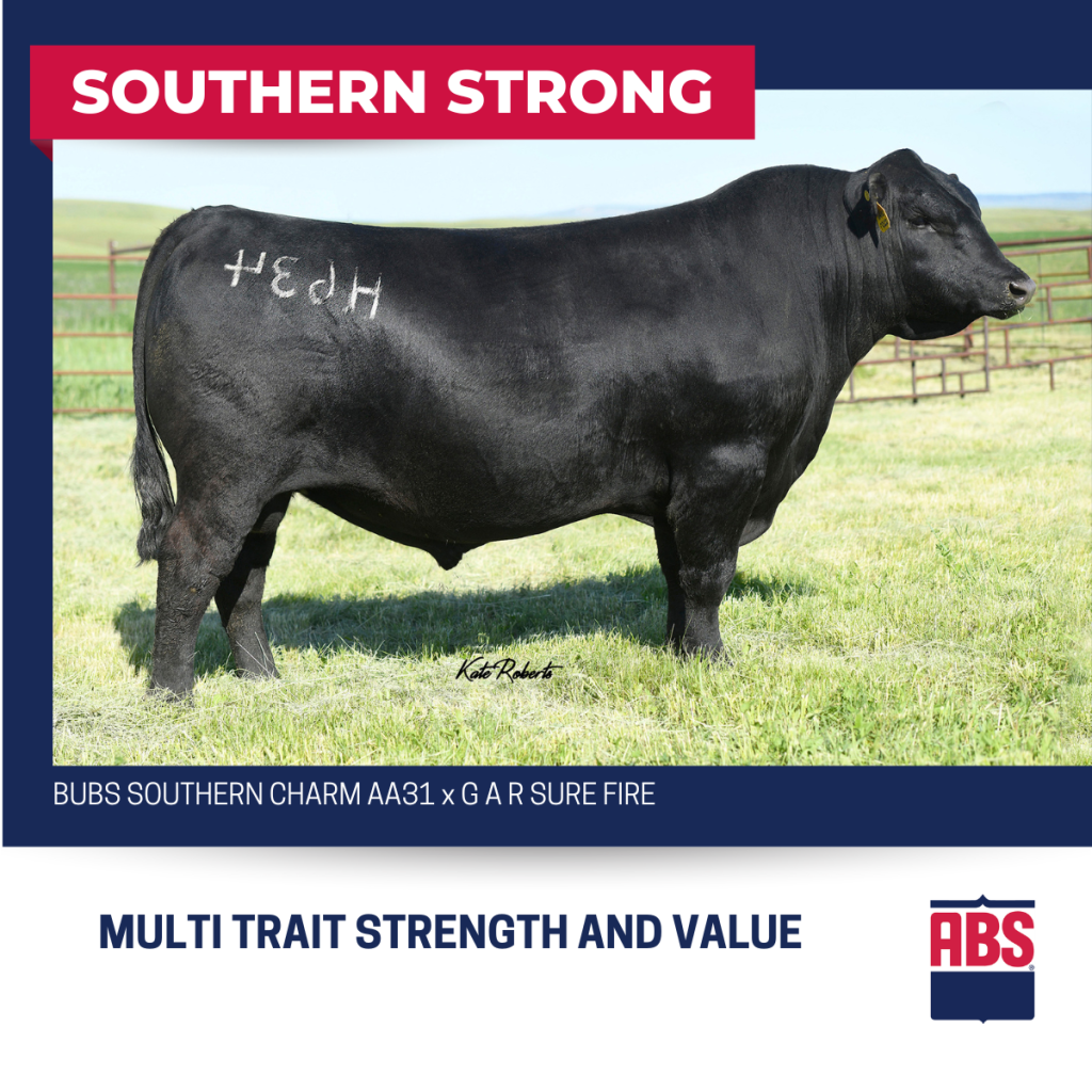 Our first highlight is SOUTHERN STRONG—a balanced-trait, top Angus bull that grabs your attention when you see him. While he is not a small bull, he offers muscle shape, a solid foot, and a deep heel. He comes from the Yon program, which is known for making economically relevant cattle. For producers in the southeast, specifically, his progeny will slick off, and for all producers, these cattle have some shape and muscle and offer a little more marbling. SOUTHERN STRONG offers excellent Calving Ease while enhancing performance with top end $Maternal and $Combined indexes. Get multi-trait strength and value with SOUTHERN STRONG.
