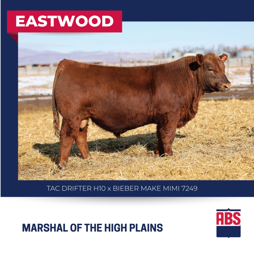 One of the newest additions to the ABS Red Angus offering, EASTWOOD combines a high-performance data package with a high-quality phenotype. The star of the 2024 sales season, his first progeny are making their mark in 2026. A moderate bull for calving ease and birth weight, EASTWOOD excels in terms of performance, muscle shape, and phenotypic appeal. Backed by a highly proven dam and a top 10% ProS index, expect him to sire productive, long-lasting daughters.