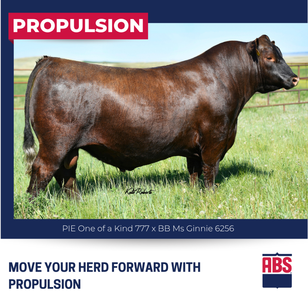 Last but not least in this group of top Red Angus sires, PROPULSION is the opportunity you’ve been looking for to move your herd forward. You love the muscle, shape, and phenotype you see when studying him, and he does not disappoint from a natural thickness and complete package standpoint. PROPULSION is big time performance with style and length to burn. Let us be frank, you’ll notice PROPULSION calves when they hit the scale at weaning time.