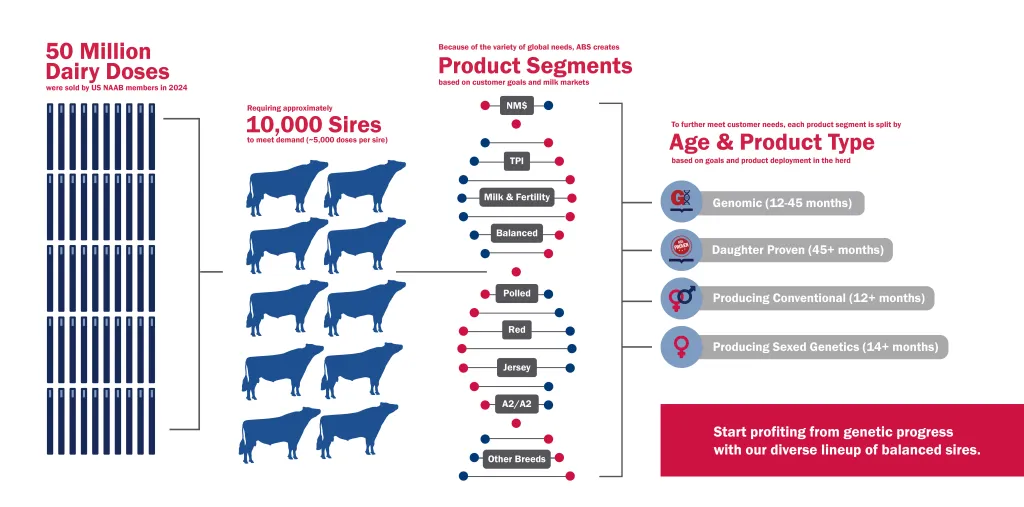 While it’s easy to become hyper focused on the industry’s most popular 100 sires, it’s important to recognize that global demand requires many sires. In 2024, 10,000 bulls were required to produce the 50 million units of semen that was sold. Why? Each farm has its own needs and goals, based on their milk market, geography, weather, environment, and so on. Thus, there’s a global need for a variety of sires.